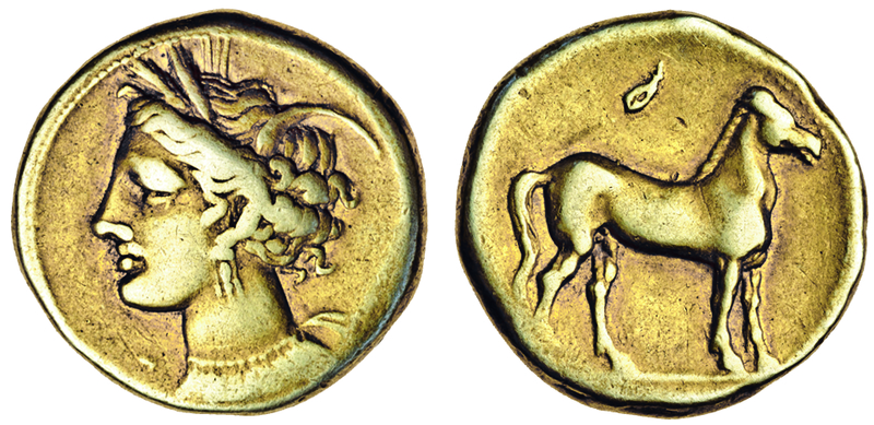N. Africa, Carthage (c.310-270 BC), Electrum Stater, 7.35g, head of Tanit left, wearing necklace and with her hair wreathed with barley, rev. horse standing right, Punic letter above (Jenkins - ; SNG Cop. - ), apparently unrecorded with letter in field, good fine