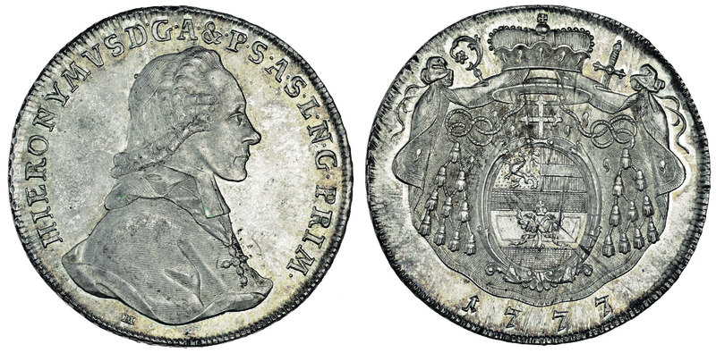 Austria, Salzburg, Hieronymus (1772-1803), Taler, 1777M, robed bust right, rev. crowned arms within mantle (Dav. 1263; KM.435), brilliance, almost as struck