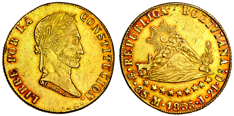 Bolivia, Republic, 8-Escudos, 1855 MJ, laureate head of Bolivar right, rev. arms (F.34; KM.116), good very fine
