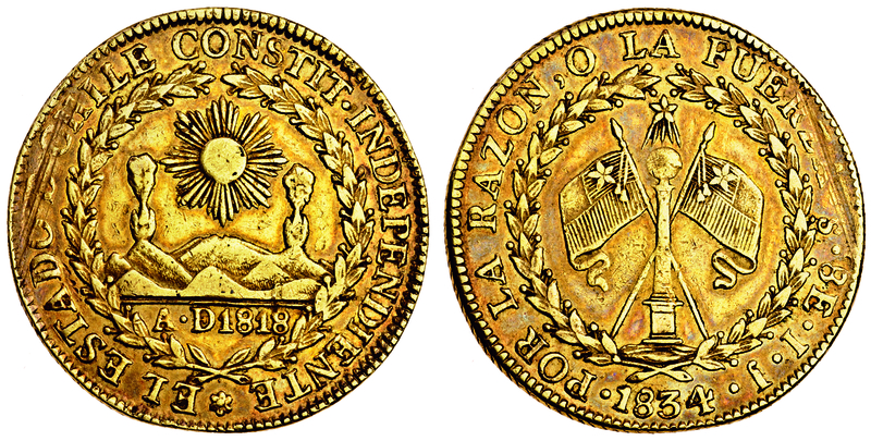 Chile, Republic, 8-Escudos, 1834 IJ, sun over mountains, rev. column between crossed flags (F.33; KM.84), adjustment marks between 9 and 11 o'clock and corresponding area on reverse, very fine