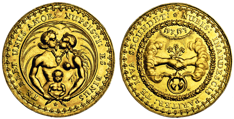 Danzig, gold Marriage Medal, signed I H (Johann Höhn), a couple embracing, wearing collars joined by a chain and heart shaped padlock, an infant between them, nupsisti es binus te beet unus amor, rev. nubis inardescis paritur: te iova secundet, clasped hands holding flowers, Hebrew letters above, hearts below, 37mm., 27.76g., pierced and plugged, otherwise good very fine, rare
