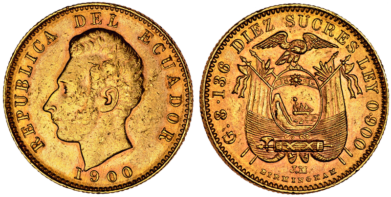 Ecuador, 10-Sucres, 1900, head of Sucre left, rev. arms (F.10; KM.56), very fine