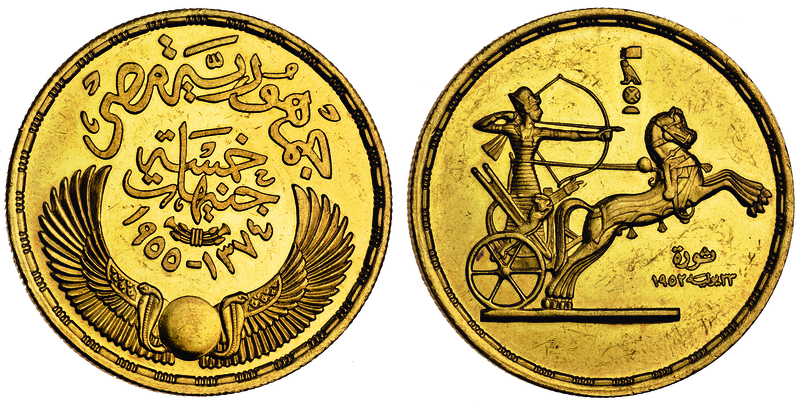 Egypt, First Republic (1953-58), 5-Pounds, 1955 /AH1374, third anniversary of the Revolution, winged symbol with legend above, rev. charioteer shooting an arrow right (KM.388), scuff marks in fields, about uncirculated
