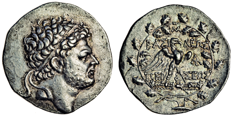 Kingdom of Macedon, Perseus (179-168 BC), AR Tetradrachm, 15.53g, diademed head of Perseus right with light beard, rev. bai- / ep-e, eagle with outstretched wings right, grasping thunderbolt, between legs, ma above, all within vine wreath (SNG Cop.1269), some marks by front of face, lightly toned, well-centred, good very fine