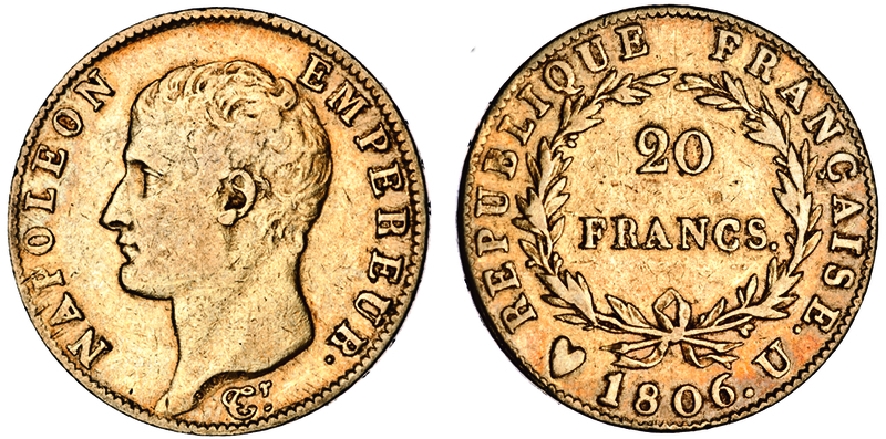 France, Napoleon, as Emperor, 20-Francs, 1806 U, Turin, head left, rev. value in wreath (F.490; KM.674.5), good fine