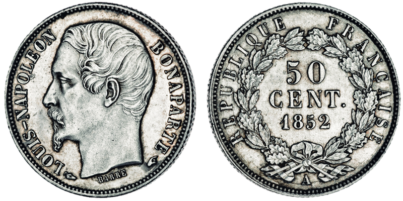 France, Second Republic (1848-52), 50-Centimes, 1852 A, head of Napoleon III left, rev. value in wreath (Gad.111; KM.793; VG 3317), extremely fine