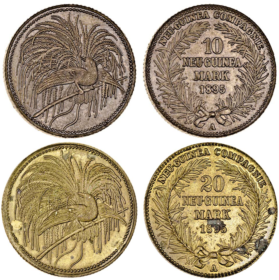 Production of the silver and copper coinage for New Guinea was commenced at the Berlin mint in 1894. The next year patterns for gold coins, the 10-Mark and 20-Mark, were produced, using the designs of the silver coinage, with only the centres of the obverses changed and appropriate denominations and dates added. The 1894 coins had won universal approval, the Bird of Paradise in particular being considered a beautifully conceived and executed design.
