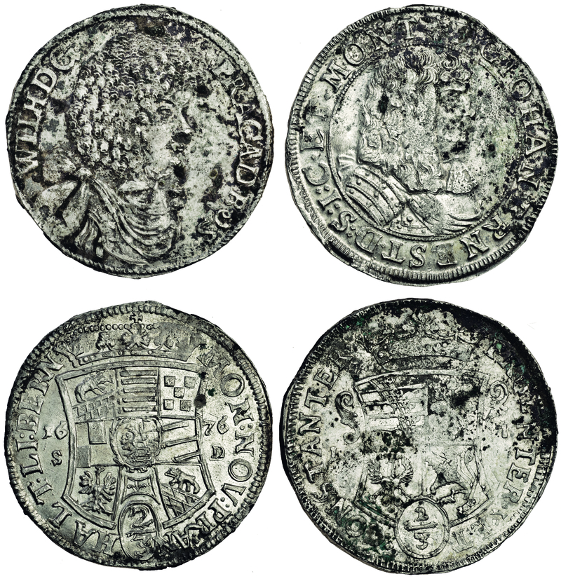Germany, Anhalt-Harzgerode, Fürstentum, Wilhelm (1670-1709), Two third-Taler (Gulden), 1676 SD, bust right, rev. crowned shield dividing date (Dav.217; KM.1.4), Saxe-Weimar, Johann Ernst (1662-83), Two third-Taler (Gulden), 1677, bust right in circle, rev. crowned arms dividing date (Dav.891; KM.104), both uncirculated coins but with heavy corrosion and therefore very fine (2)