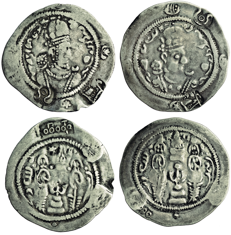 Turco-Hephthalite (c.7th century), countermarked Sasanian Drachms (2), host coins of Hormazd IV, both countermarked with human face left and tamgha (Göbl 14), one with Hephthalite inscription (Göbl 59) (JONS 169, 2001, pp.3-4), good fine (2)