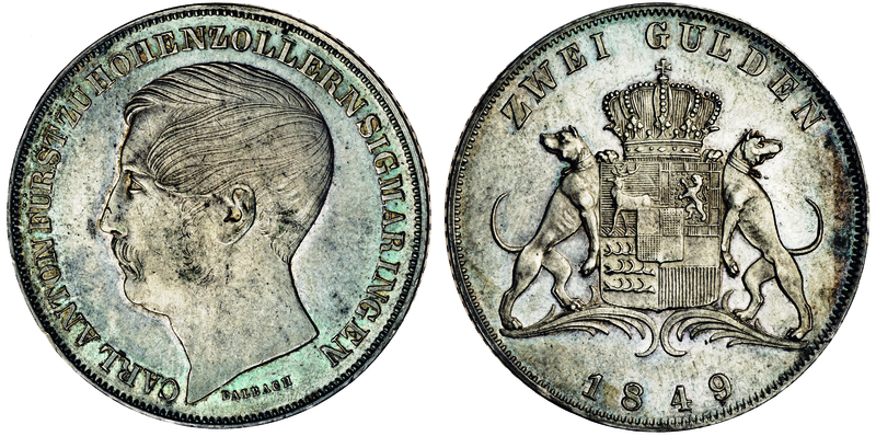 Germany, Hohenzollern Sigmaringen, Carl (1831-48), 2-Gulden, 1849, head left, rev. crowned shield with supporters (KM 24), light marks, nearly extremely fine
