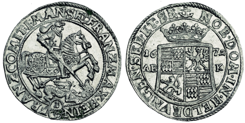 Germany, Mansfeld-Bornstedt, Franz Maximilian (1644-92), with Heinrich Franz (1644-1715), Third-Taler (Half-Gulden), 1672 ABK, Eisleben, St George galloping right, lancing dragon, value below, rev. crowned shield dividing date (KM.125; Tornau 311d), trace of verdigris on obverse otherwise sharp extremely fine