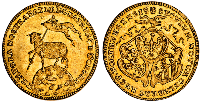 Germany, Nürnberg, Lamb Ducat, undated (c.1700 - MDCC in chronogram), 3.47g, Paschal Lamb, rev. three shields (F.1885; Kellner 71), good very fine