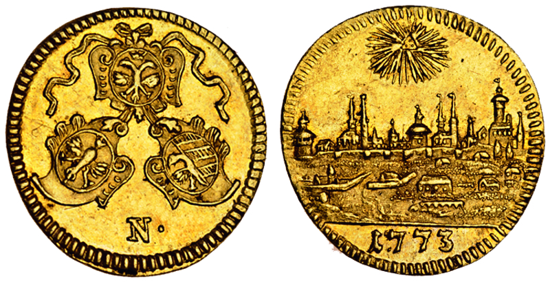 Germany, Nürnberg, Joseph II (1765-90), Half-Ducat, 1773, three shields, variety with stop after N below, rev. sun over city view, date below, 1.75g (F.1912; Ke.92 (78)), extremely fine