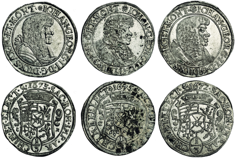 Germany, Saxony, Johann Georg II, Third-Talers (3), 1672, 1673, 1675, draped and cuirassed bust right, rev. crowned shield (KM.547), some verdigris on the 1675, otherwise all extremely fine (3)