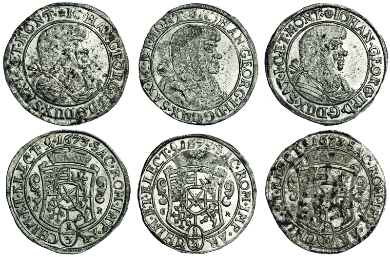 Germany, Saxony, Johann Georg II, Third-Talers (3), all 1673, draped and cuirassed bust right, rev. crowned shield (KM.547), some verdigris, otherwise all extremely fine (3)