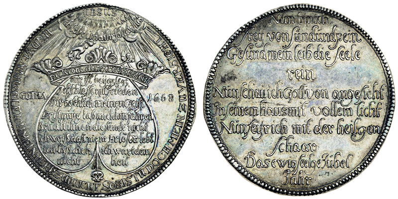 Germany, Saxe-New-Gotha, Ernst I (the Pius) (1640-75), Taler, 1668, hand holding crown over legend dividing gotha and date, jesus and radiate clouds above, skull below, rev. ten line inscription (Dav.7448; Schnee 424), wavy flan, extremely fine, old tone with underlying lustre