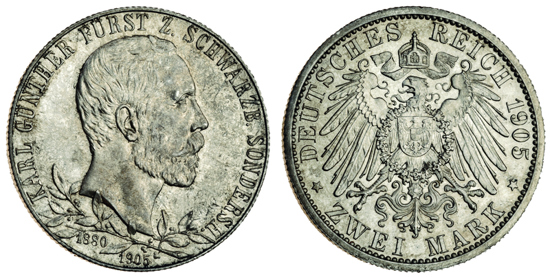 Germany, Schwarzburg-Sonderhausen, Karl Gunther (1880-1909), 2-Marks, 1905, on the 25th anniversary of his reign, head right, rev. eagle, thin rim variety (J.169a; KM.Y211), extremely fine