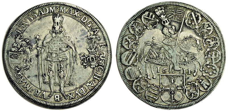 Germany, Teutonic Order, Maximilian of Austria (1590-1618), Taler, 1611, Hall, crowned, armoured figure standing holding sword to left, rev. Emperor riding right, shields around (Dav. 5850A; KM.12), very fine