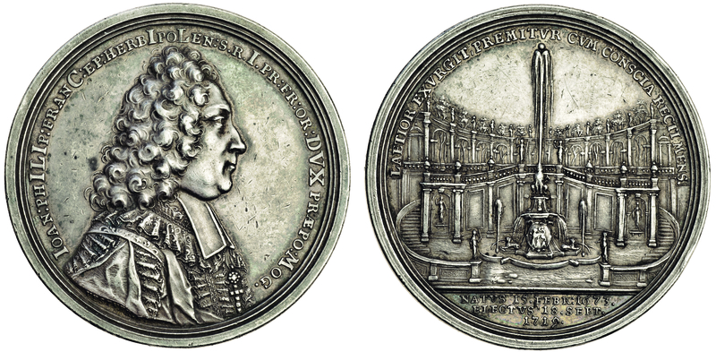 Germany, Würzburg, Johann Philipp Franz von Schönborn (1719-24), silver medal on his election 1719, by Vestner, bust right, rev. fountain (der 'schöne Born') with Baroque arcade and statues, 48.9mm. (Bernh. 170; Erlanger part II, 2818; Helmschrott 552), nearly extremely fine, rare