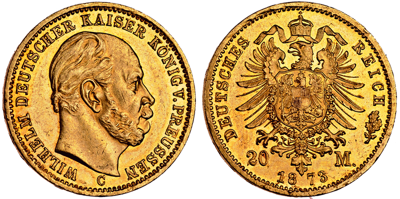 Germany, Wilhelm I (1861-88), 20-Marks, 1873 C, Frankfurt, head right, rev. arms (F.3815; KM.501), extremely fine
