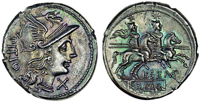L. Sempronius Pitio (148 BC), Denarius, Rome, helmeted head of Roma right, x below chin, rev. the Dioscuri on galloping horses right, holding lances (Crawford 216/1; Syd. 402), lovely iridescent toning, extremely fine