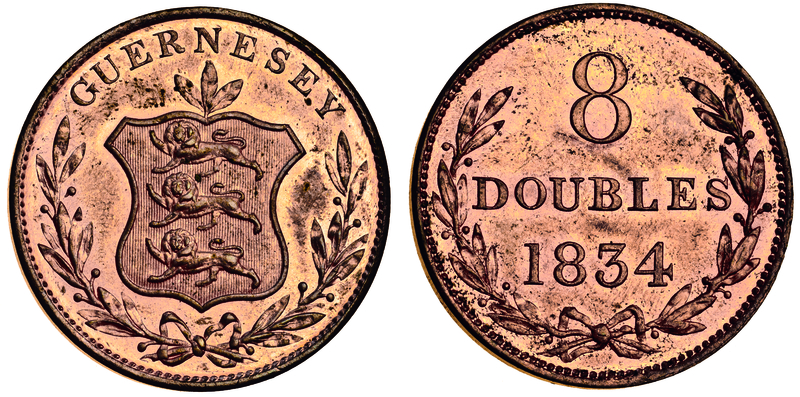 Guernsey, William IV (1830-37), 8-Doubles, 1834, shield above wreath, rev. value within wreath (Prid. 1a; S.7200), full lustre, uncirculated