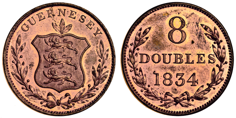 Guernsey, William IV, 8-Doubles, 1834, shield above wreath, rev. value within wreath (Prid 1a; S.7200), full lustre, uncirculated