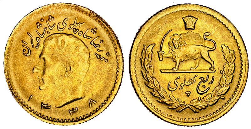 Iran, Pahlavi Dynasty, Muhammad Reza Shah (1941-79), Quarter-Pahlavi, SH1338 (1959) (KM.1160a), weakly struck, extremely fine