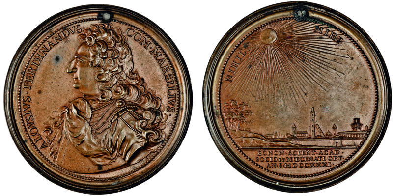 Italy, Bologna, bronze medal, 1731, by Ferdinand de Saint Urbain, draped and armoured bust of Count Luigi Ferdinando Marsigli (1658-1730), rev. nihil mihi, radiant sun above city, 60mm. (Forrer 312, no. 87), pierced at 12 o'clock, good very fine