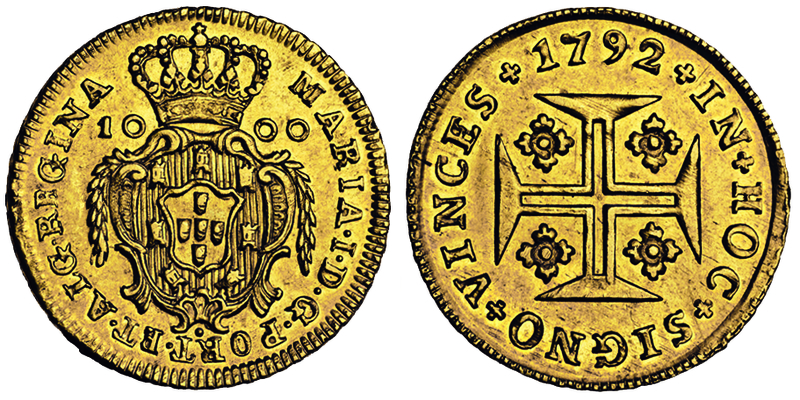 Portugal, Maria I (1786-99), 1000 Reis (Quartino), 1792, crowned arms, rev. cross potent (F.120), extremely fine