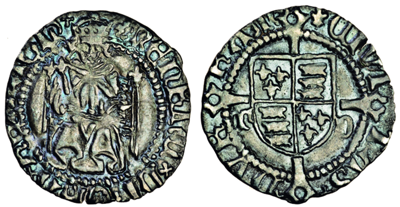 Henry VIII, first coinage 1509-26, Penny, 0.64g, sovereign type, Durham, Bishop Ruthall, m.m. lis, king seated facing holding sceptre, rev. civitas dvrham, shield over long cross fourchée, t d in field to sides (N.1777; S.2332), dark tone, good detail, an attractive example of this coin, good very fine