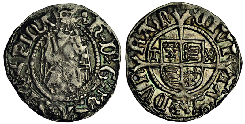 Henry VIII, second coinage, 1526-44, Penny, 0.69g, sovereign type, Durham, Bishop Wolsey, m.m. trefoil, king, crowned, seated facing, rev. civitas dvrram shield over long cross fourchée, t w at sides (N.1811; S.2352), toned, strong reverse, very fine / good very fine, attractive