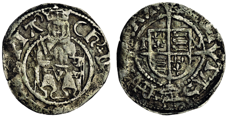 Henry VIII, second coinage, 1526-44, Penny, 0.54g, sovereign type, Durham, Bishop Wolsey, m.m. crescent, king, crowned, seated facing, rev. civitas dvrram shield over long cross fourchée, t w at sides, Cardinal's hat below (N.1811; S.2352), about very fine