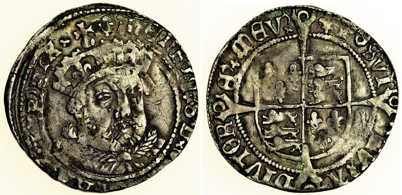 Henry VIII, third coinage, 1544-47, Groat, 2.35g, Tower, m.m. lis, bearded, crowned facing bust half right, bust 1, rev. shield over long cross fourchée, annulet in forks (N.1844; S.2369), obverse off-centre, double striking in places, bold bust, even old tone, almost very fine