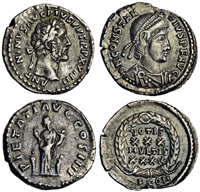 Antoninus Pius (138-61), Denarius, Rome 160-61, Pietas, holding two babies, standing between two children, pietati avg cos iiii (RIC 313c), an English field find, good fine, Constantius II (337-61), Siliqua, 1.94g, Arles, c.353-60, diademed, draped and cuirassed bust right, rev. votis / xxx / mvltis / xxxx within wreath, p con below (RSC 342-3c), an English field find, broad flan, very fine (2)