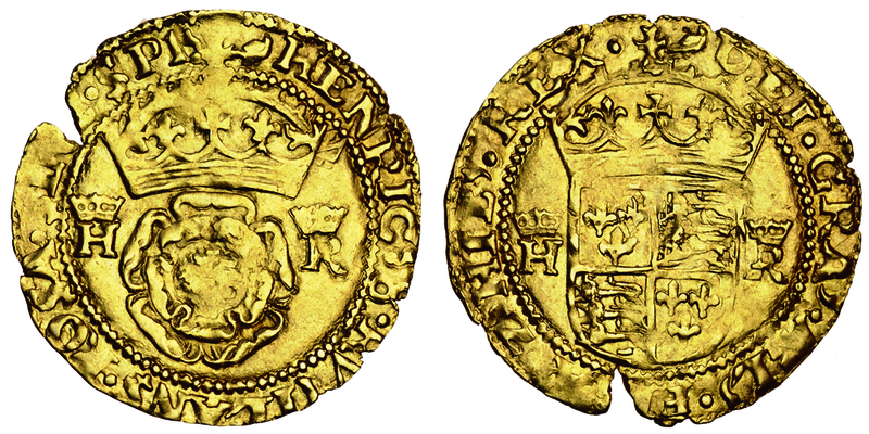 Edward VI, coinage in the name of Henry VIII, 1547-51, Crown of the Double Rose, 3.25g, Tower, m.m. martlet, pellet stops, crowned rose dividing crowned h and r, rev. crowned shield dividing crowned h and r (cf Schneider 662; N.1867; S.2395), flan striking crack at ten o'clock, some weakness, very fine, rare