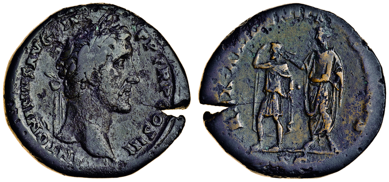 Antoninus Pius, Sestertius, Rome, 143, laureate head right, rev. [r]ex armeniis [datv]s, s c, Antoninus, togate, standing left, holding scroll and placing tiara on the head of the king of Armenia standing before him, looking left (RIC 619; BMC 1272; C. 686), edge split, dark brown patina, good fine, rare