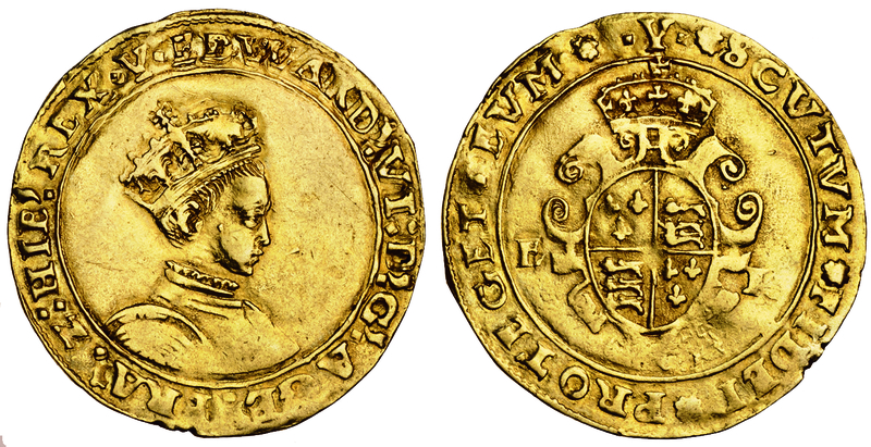 Edward VI, coinage in his own name, second period, January 1549 - April 1550, Half Sovereign, 5.33g, Southwark, m.m. y, crowned bust right, lozenge stops, rev. crowned garnished shield dividing e r, rosette stops (cf Schneider 687; N.1908; S.2438), slight creasing, nearly very fine, rare