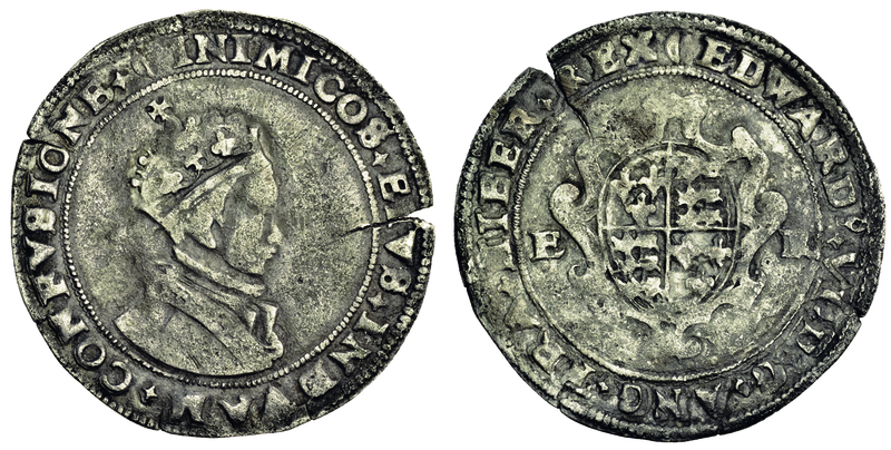Edward VI, coinage in his own name, second period, January 1549 - April 1550, Shilling, 4.52g, undated, Durham House, m.m. bow, crowned bust right, inimicos eivs indvam confvsione, rev. edward vi d g ang fra hiber rex, crowned garnished shield dividing e r (N.1924; S.2470), edge split at three o'clock, nearly very fine, very rare
