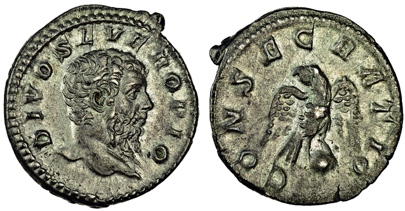 Divus Septimius Severus (†211), Denarius, Rome, under Caracalla and Geta, bare head right, divo severo pio, rev. consecratio, eagle standing on globe, head left (RIC 191c; BMC 21; C. 84), toned, extremely fine