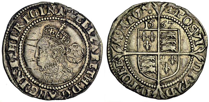 Elizabeth I, third and fourth issues, 1561-77, Sixpence, 2.87g, 1567, m.m. coronet, crowned bust left, rev. shield over long cross fourchée (N.1997; S.2562), marks by head, very fine