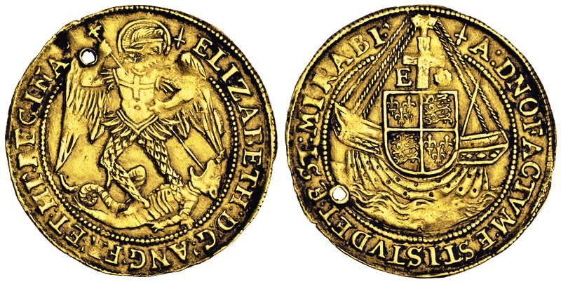 Elizabeth I, fifth issue, 1578-82, Angel, 5.10g, m.m. sword, St Michael spearing dragon, rev. shield within ship, cross above dividing letter e and a rose (cf Schneider 769; N.1991/1; S.2525), pierced by hand of St Michael with adjacent plugged piercing, otherwise very fine, rare