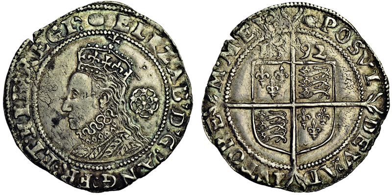 Elizabeth I, sixth issue, 1582-1600, Sixpence, 2.38g, 1592, m.m. tun, crowned bust left, rev. shield over long cross fourchée (N.2015; S.2578C), stress marks in fields, very fine
