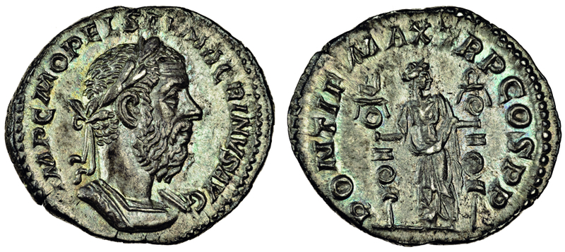 Macrinus (217-18), Denarius, Rome, 217, laureate, cuirassed bust right, rev. pontif max tr p cos p p, Fides Militum standing facing, head right, holding standard in each hand (RIC 22A; BMC 38; C. 60), cabinet tone with some iridescence, a superb portrait, extremely fine