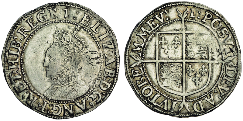 Elizabeth I, seventh issue, 1600-02, Shilling, 5.90g, m.m. 1, crowned bust left, rev. shield over long cross fourchée (N.2014; S.2584), stress mark in field behind head, nearly very fine