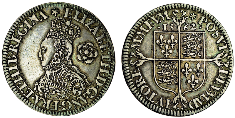 Elizabeth I, milled coinage, 1560-71, Sixpence, 3.18g, 1562, m.m. star, crowned tall bust with elaborate dress left, rev. shield over long cross fourchée (Borden and Brown 24 O3/R2; N.2026; S.2595), very fine