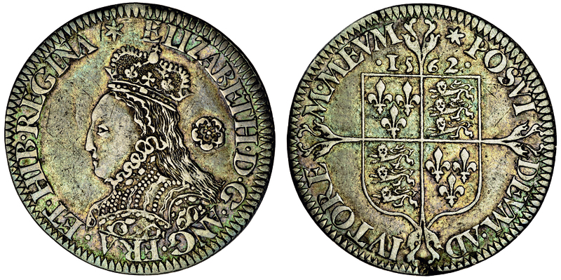 Elizabeth I, milled coinage, 1560-71, Sixpence, 3.06g, 1562, m.m. star, crowned large broad bust with elaborate dress left, rev. shield over long cross fourchée (Borden and Brown 25 O8/R5; N.2027; S.2596), flan flaw in front of face, very fine
