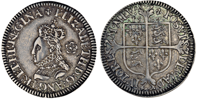 Elizabeth I, milled coinage, 1560-71, Sixpence, 3.11g, 1567, m.m. lis, crowned small bust left, regina, rev. shield over long cross fourchée (Borden & Brown 39 O1/R1; N.2030; S.2599), even old tone, very fine