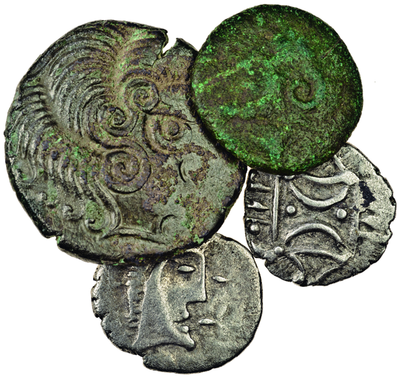 Celtic, Coriosolites c.75-50 BC, billon Stater 5.97g, head right, rev. horse right, boar below (S.14), edge split, nearly very fine, Iceni, AR Units (2), 1.22g, head right, rev. horse right (Mack 413; BMC 3556-3604; Rudd ABC 1564; S.434), very fine, 1.27g, Ecen symbol type, double cresent emblem, rev. horse right (Mack 429, BMC 4297-4325; Rudd ABC 1681; S.436), about very fine / fine, Catuvellauni and Trinovantes, Cunobelin (c.AD 8-41), AE Unit, 2.14g, bearded head of Jupiter Ammon left, rev. horseman right (Mack 251; BMC 1984-86; Rudd ABC 2978; S.345), about fine (4)