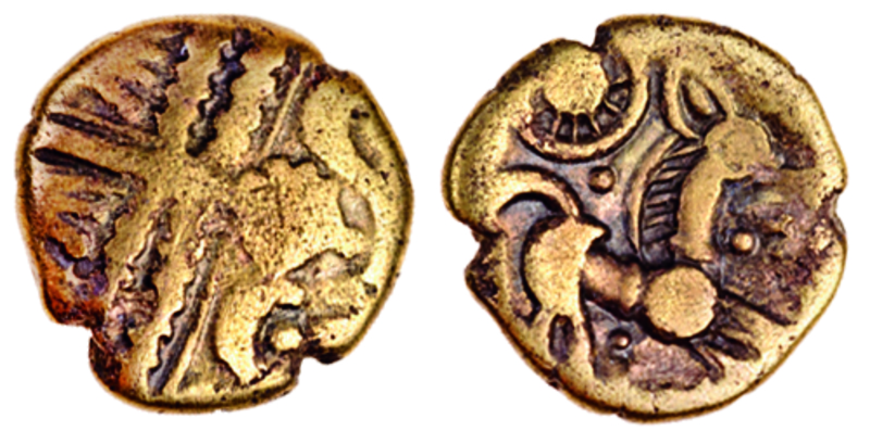 Celtic, Belgae, uninscribed coinage, c.50 BC, gold Quarter Stater, 0.88g, Petersfield wreath face type, wreath design, rev. horse right, moon shaped rump, ladder mane, wheel above and below (Mack -; BMC 568-70; Rudd ABC 773; S.-), good fine, a rare type